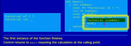 6 to 8 we can come back to the first call of factorial in the main program.